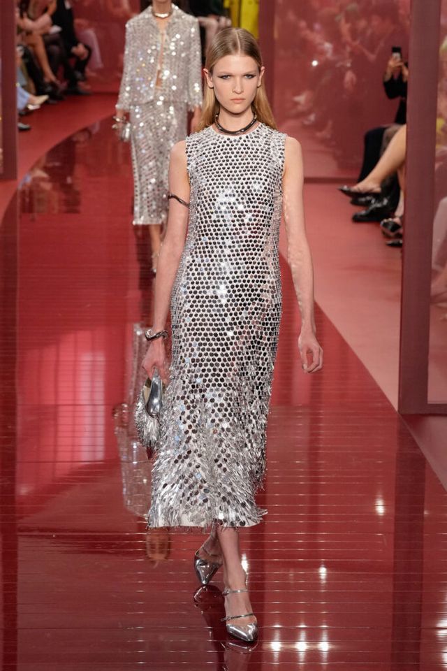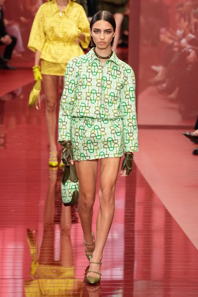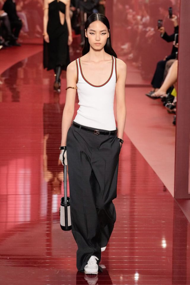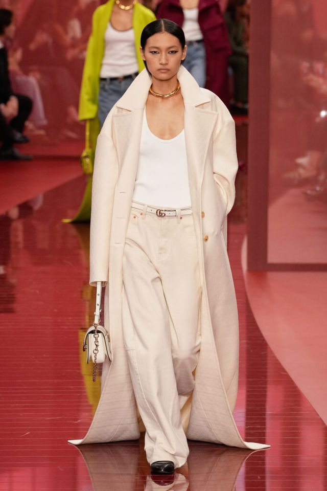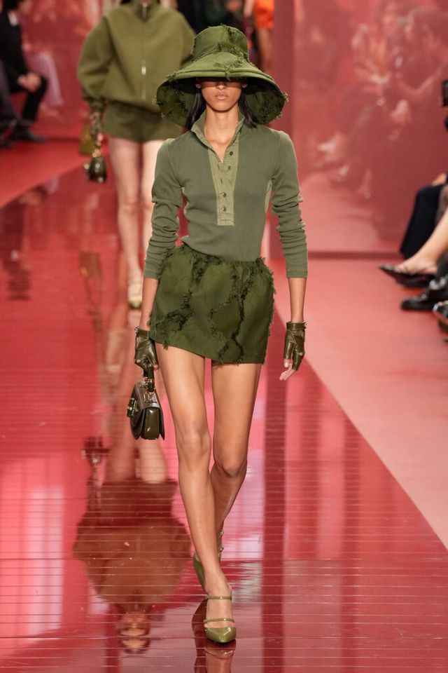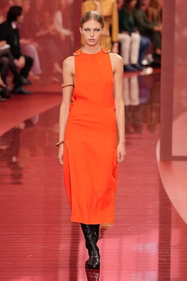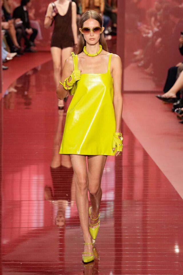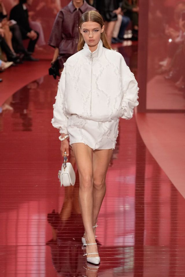 NOTE ‘태양이 바닷속으로 잠기는 찰나는 온전한 우리 자신을 발견할 수 있는 순간’이라는 이야기를 담고 싶었던 사바토 데 사르노. 화이트, 옐로, 오렌지, 짙은 버건디의 구찌 로소 앙코라로 점차 깊어지며 여름날의 석양빛에서 영감을 받은 컬러가 중심을 이뤘다. ‘캐주얼한 우아함’이 깃든 1960년대 식 실루엣은 당장 입고 해변으로 뛰어가고 싶을 만큼 센슈얼하고 감각적이다. 피날레에서는 마치 해변에서 리듬을 타는 듯한 모델들의 흥겨움으로 고조되며 아름다운 구찌의 여름을 완성했다.