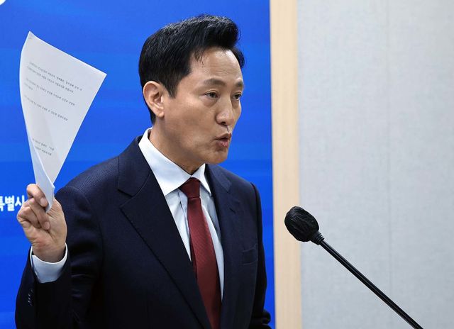오세훈 서울시장이 2024년 12월 3일 오후 서울 중구 서울시청에서 가진 명태균 여론조작 사기 사건 관련 긴급 기자회견에서 명 씨 등에 대한 고소장 요약본을 들어 보이고 있다. / 뉴스1