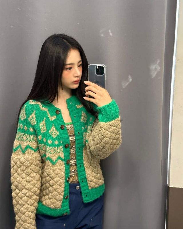 민지는 빈티지 무드가 돋보이는 패턴 카디건을 선택했습니다. 그린과 베이지 컬러가 어우러진 니트 가디건은 따뜻한 감성을 더하죠. 특히, 퀼팅 디테일이 더해져 독특한 질감으로 시선을 사로잡는데요. 이너로는 패턴이 들어간 니트 톱을 선택하고, 네이비 팬츠를 매치해 자연스럽고 편안한 분위기를 연출했습니다. 포근한 니트 조직과 컬러 밸런스를 활용한 레트로 감성의 스타일링이 돋보입니다.