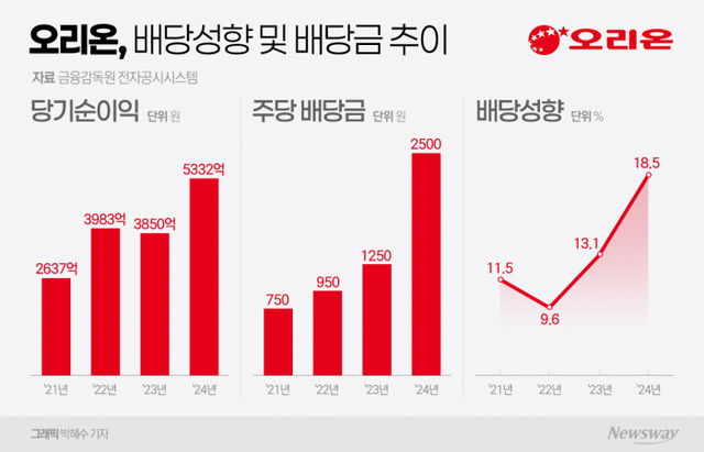 20일 금융감독원 전자공시에 따르면 오리온은 2024년 회계연도 결산에서 주당 배당금을 기존 1250원에서 2500원으로 올렸다. 배당금 총액은 988억원으로 작년(494억원)의 약 두 배 규모다. 배당성향은 18.5%다. 배당성향은 당기순이익 중 배당금으로 지급되는 비율을 말한다.