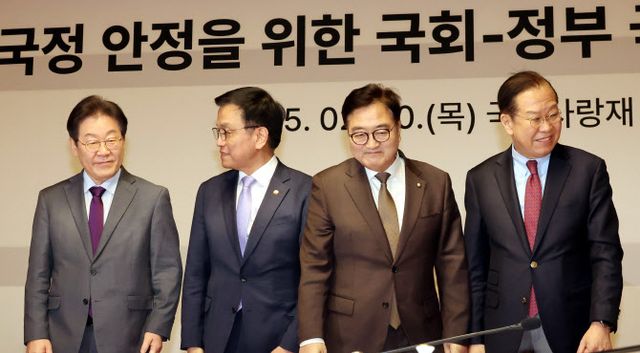 민생에 관해 최 대행은 “민생 회복 지원 법안에 대한 국회의 전폭적인 지원을 부탁드린다”며 △영세 소상공인 점포에서의 신용카드 소득공제 확대 △상반기 추가 소비분 소득공제 확대 △재건축·재개발 촉진법 제정 △하늘이법(정신질환이나 폭력성을 보이는 교원의 분리·휴직을 강화하도록 하는 법) 제정 △연금개혁 합의를 국회에 요청했다. 이날 최 대행과 우원식 국회의장, 여야 대표는 추가경정예산(추경) 편성도 논의할 예정이다.