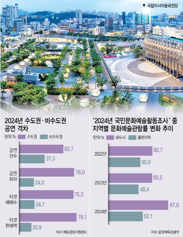 수도권과 지역 간 문화예술 격차는 갈수록 심화하고 있다. 20일 예술경영지원센터의 ‘2024년 총결산 보고서’를 보면, 지난해 서울에서 진행한 공연 건수와 회차는 각각 9966건과 8만 2160회로 집계됐다. 지난해 전체 공연건수(2만 1634건)와 공연회차(12만 5224회)의 46.1%, 65.6%에 달했다.
