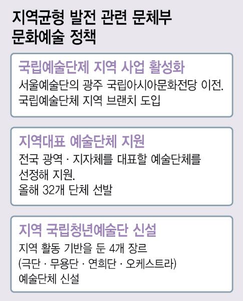 정부는 주요 지역에 극단·무용단·연희단·오케스트라 등 4개 장르의 국립 청년예술단체를 신설하고, 국립예술단체들의 ‘지역 분원‘을 두는 것도 검토 중이다. 예컨대 ‘국립발레단 부산’, ‘국립오페라단 대구’ 등을 만들어 지역 문화를 활성화해 ‘지방 소멸’ 위기에 대응한다는 것이다.