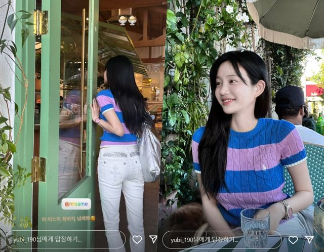 파란색과 분홍색의 가로 스트라이프 니트와 연한 청바지를 매치한 이유비는 청량한 매력을 발산해 눈길을 끌었다. 특히 그는 늘씬한 각선미를 자랑하며 완벽한 청바지 핏을 자랑해 감탄을 자아내기도 했다.