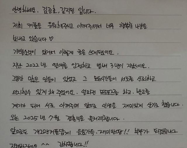 김지민은 20일 자신의 계정에 김준호와 함께 쓴 손편지를 공개하며 "저희 커플을 응원해주시고 아껴주셔서 너무 행복한나날을 보내고 있다"고 전했다.