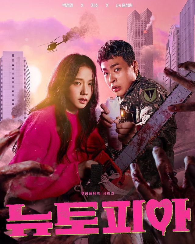 쿠팡플레이 시리즈 〈뉴토피아〉 역시 한 장의 이미지로 강렬한 인상을 남겼다. 이 작품은 박정민과 지수가 출연하는 좀비 코믹물로, 군인 재윤과 곰신 영주가 좀비로 뒤덮인 서울 도심을 가로질러 서로에게 달려가는 이야기를 예고한 작품. 하지만 초반 공개된 지수의 캐릭터 포스터는 그 자체로 뜨거운 화제를 모았다. 형광빛 전기톱을 피로 물들인 채 해맑게 웃고 있는 모습은, 지금껏 블랙핑크 지수가 보여줬던 이미지와는 완전히 다른 분위기를 자아냈기 때문. 이 강렬한 콘셉트는 메인 포스터에서도 이어지며, 지수는 전기톱을 든 채 중심에 서 있다. 총 8부작 중 3회까지 공개된 현재, 시청자들의 가장 큰 궁금증은 단연 "지수가 전기톱을 들고 활약하는 순간이 언제 나오느냐"일 것이다.