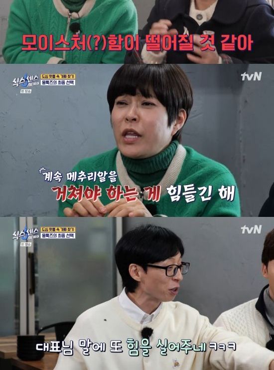 조혜련은 "난 먹을 때마다 메추리알을 거쳐야 하는 게 좀 힘들긴 하다"라며 맞장구쳤고, 유재석은 "누난 두 번째잖아. 대표님 말에 힘을 실어주네"라며 웃음을 터트렸다.
