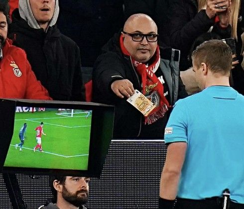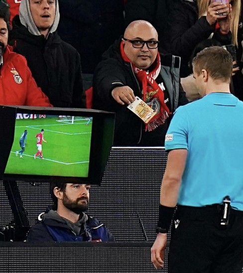 해당 장면은 이번 경기 후반 VAR 판독 당시 상황이다. 글렌 니버그 주심이 VAR을 확인하고 있었다. 그때 뒤에서 한 벤피카팬으로 추정되는 인물이 현금을 주심에게 건넸다.