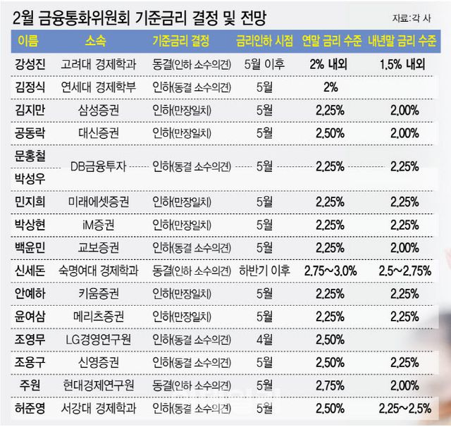 거시경제 전문가들도 대내외 불확실성을 이유로 비슷한 입장을 보였다. 허준영 서강대 경제학부 교수는 “국내에선 조기 대선 가능성이 큰 상황이고 트럼프 2기 정책이 적어도 올 상반기 중에는 지속적으로 발표될 것을 감안해야 할 것”이라며 “다음 금리 인하 시점은 조기 대선에 대한 윤곽이 잡히고 4월 중 트럼프 정책의 불확실성이 상당 부분 해소된 이후인 5월이 될 것”이라고 관측했다. 강성진 고려대 경제학과 교수는 “일단 물가가 안정이 되고 미국 경제 정책 방향이 명확해지는 5월 이후에 추가 금리 인하에 나설 것”이라고 봤다.