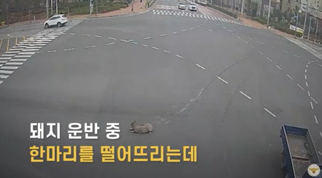 해당 사건은 지난달 7일 경남 김해의 한 교차로에서 벌어졌다. 당시 신호가 바뀌며 교차로를 통과하고 있던 대형 탑차는 좌회전을 하며 커브를 돌았고, 이때 차에서 돼지 한 마리가 굴러 떨어졌다.