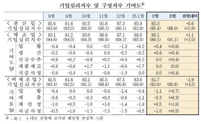 이혜영 한국은행 경제심리조사팀장은 “제조업의 경우 영업일 수가 늘었고 자동차는 트럼프 관세 정책 시행 전 선발주 증가로, 전자영상은 스마트폰 신제품 출시로 각각 업황이 개선됐다”면서 “비제조업에서는 민간 소비와 관련해 도소매업 업황이 안 좋게 나왔고 건설업은 부동산 경기 악화로 매출, 채산성이 모두 안 좋았다”고 설명했다.