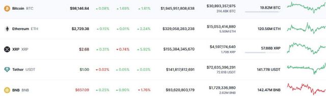 21일 글로벌 가상자산 시황중계 사이트 코인마켓캡에 따르면 이날 오전 7시 55분 기준 비트코인 가격은 24시간 전 대비 1.69% 상승한 9만 8146달러를 기록했다. 같은 시간 알트코인(비트코인 외 가상자산)의 대표격인 이더리움은 전일 대비 0.01% 오른 2729달러에 거래됐다.