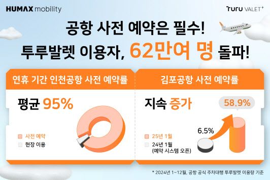 투루발렛은 지난해 양 공항에서 약 62만여명에게 주차대행 서비스를 제공했다. 특히 사전예약 시스템 고도화를 통해 인천공항의 경우 지난해 평균 약 98% 사전예약률을 기록했다. 김포공항은 지난해 1월 사전예약제를 처음 도입했을 당시 6.5%에 불과했던 예약률이 1년 만인 올해 1월 58.9%까지 상승했다.