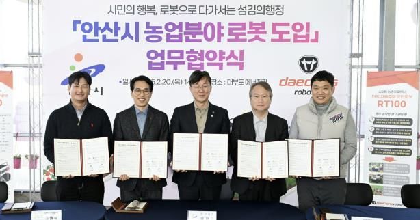 안산시는 지난 20일 대부도 에너지 팜에서 대동로보틱스, 농협중앙회 안산시지부, 안산시 4-H 연합회, 안산시주민자치협의회와 함께 농업 분야 로봇 도입을 위한 업무협약을 체결했다고 21일 밝혔다.