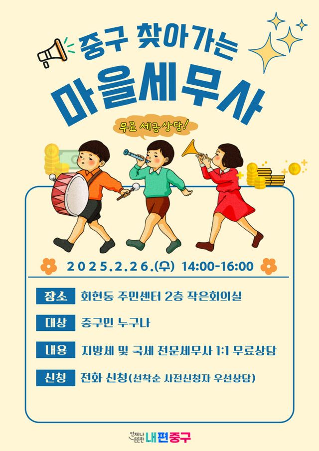 중구에서 활동 중인 9명의 마을세무사는 지방세 및 국세와 관련해 1:1 무료상담을 제공한다. 올해부터는 동 주민센터 공간을 활용하고 중구를 6개의 권역으로 나누어 짝수달마다 개최해 총 6회 ‘찾아가는 마을세무사’를 운영한다. 오는 26일에는 회현동 주민센터에서 상담을 진행 예정이며, 신당동(4월), 을지로동(6월), 장충동(8월), 청구동(10월), 신당5동(12월)에 각각 상담을 진행한다는 계획이다.