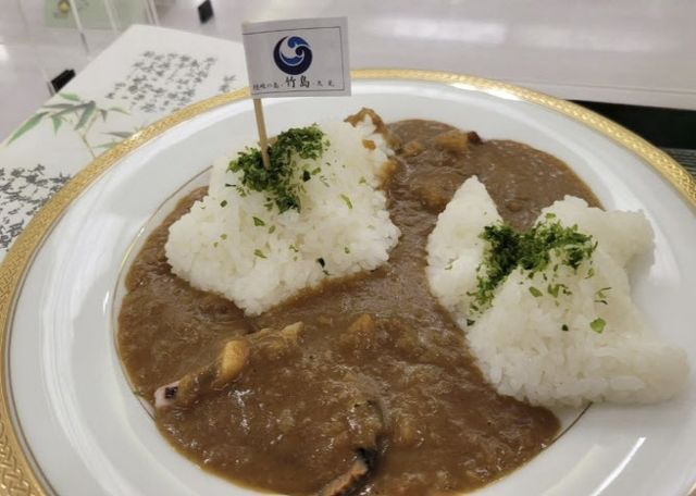 ‘다케시마 카레’는 시마네현 오키 제도 바다에서 잡은 오징어, 뿔소라 등 해산물을 넣은 카레 소스 위에 3D 프린터로 만든 독도 모양의 밥을 얹은 게 특징이다. 밥 위에는 ‘다케시마’를 뜻하는 ‘죽도(竹島)’ 깃발이 꽂혀있다.