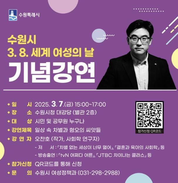 수원시 관계자는 “세계여성의날을 기념해 시민과 공무원이 함께 참여할 수 있는 강연을 마련했다”며 “오찬호 작가의 강연이 성평등한 수원시를 만들어가려는 시민들에게 다양한 아이디어를 제공하는 기회가 되길 바란다”고 밝혔다.