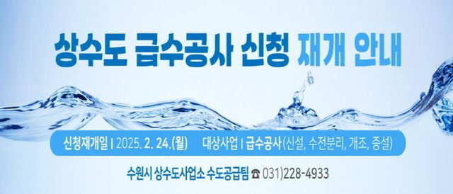 전화·팩스·방문(장안구 광교산로 119, 수원시상수도사업소)으로 신청할 수 있다. 신청서 등 자세한 사항은 수원시상수도사업소 홈페이지 ‘급수 정보→급수공사 신청 안내’에서 확인할 수 있다.