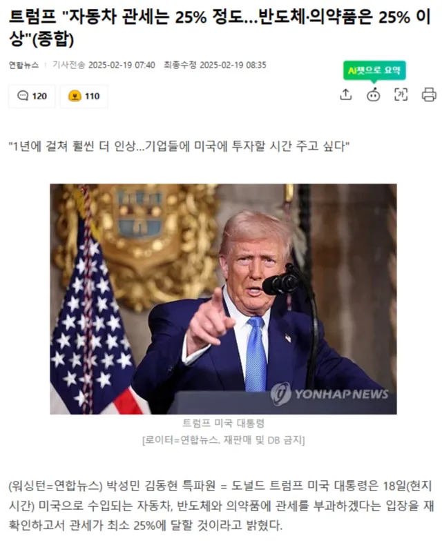 트럼프 "자동차 관세는 25% 정도.. 반도체·의약품은 25% 이상"
