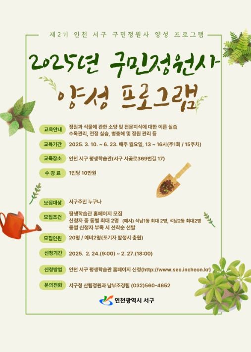 [파이낸셜경제=김영란 기자] 인천 서구는 식물에 대한 소양 및 전문적인 지식을 교육하는 ‘제2기 구민정원사 양성 프로그램’ 교육생20명을 이달 24일부터 27일까지 모집한다”고 밝혔다.