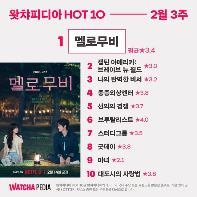 넷플릭스 오리지널 시리즈 ‘멜로무비’가 강력한 경쟁작들을 제치고 2월 3주차 왓챠피디아 인기 콘텐츠 1위에 올랐다. ‘중증외상센터’가 지난 몇 주간 1위 자리를 지켰으나, 이번 주에는 ‘멜로무비’에 밀려 4위로 하락했다.