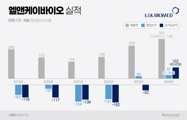 21일 전자공시시스템에 따르면, 엘앤케이바이오는 지난해 연결기준 매출 361억원, 영업이익 31억원을 기록해 전년 대비 각각 20.7%, 51.3% 증가했다. 특히 당기순이익 102억원을 기록하며 300%에 육박한 성장률을 나타냈다. 2016년 18억여원의 순이익을 기록한 이후 8년 만에 흑자 달성이다.