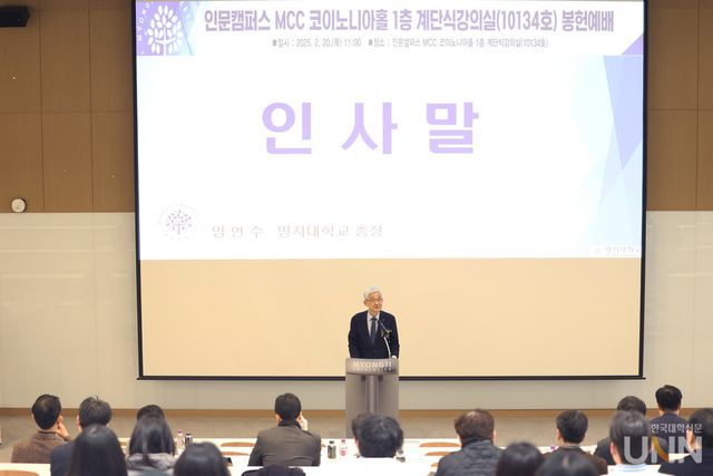 [한국대학신문 이정환 기자] 명지대학교(총장 임연수)가 인문캠퍼스 MCC관 1층 코이노니아홀 계단식강의실(10134호) 조성 봉헌예배를 20일 진행했다.