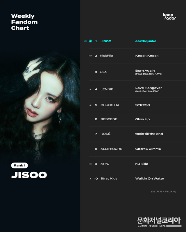 문화저널코리아 김영일 기자 | 그룹 블랙핑크 멤버이자 솔로 가수 지수가 ‘케이팝레이더(K-POP RADAR)’의 위클리 팬덤 차트 정상을 차지했다.