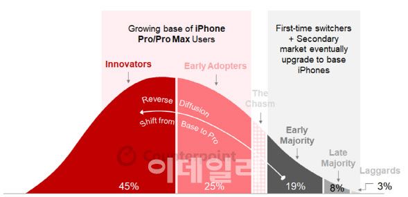 전체 프로 모델 사용자 중 45%는 스스로를 ‘이노베이터’, 25%는 스스로를 ‘얼리 어답터’로 인식한다고 응답했다. 그들은 애플의 신제품 출시일에 맞춰 제품을 구매하고, 신규 아이폰이 출시되면 가장 먼저 프로 모델을 구매하려는 경향이 있다. 이를 통해 프로 모델 사용자들이 왜 더 자주 스마트폰을 교체하는지 알 수 있다.