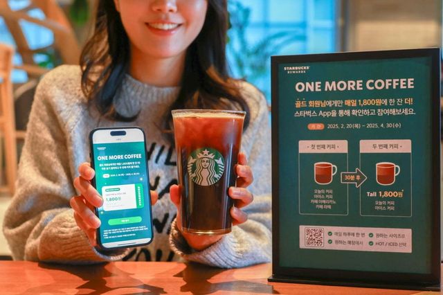 스타벅스 코리아는 오는 4월 30일까지 특정 음료 4종을 구매하는 골드 회원을 대상으로 ‘원 모어 커피’ 서비스를 시범 운영한다. 스타벅스 카드가 등록된 앱으로 카페 아메리카노, 카페 라떼, 오늘의 커피, 아이스 커피를 주문하면 혜택을 받을 수 있다.