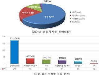 이에 따르면 자원 활용 목적에서 진단기술 연구가 58%로 가장 많았고 백신 및 치료제 연구가 14%였다.