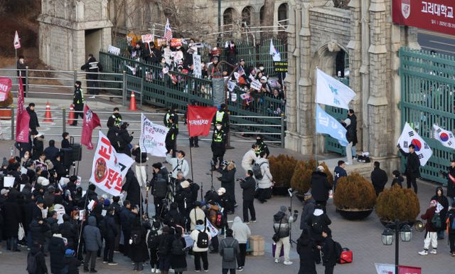 현장 출동한 경찰 기동대와 학교 직원들이 정문을 닫고 양측을 분리하는 조치를 취했다. 또 또탄핵을 지지하는 유튜버 등이 보수 유튜버들의 캠퍼스 진입을 막는 과정에서 2명이 다쳐 병원 이송됐다. 이 와중에도 보수 유튜버들은 “빨갱이 쇼하지 말라”며 욕설을 멈추지 않았다.