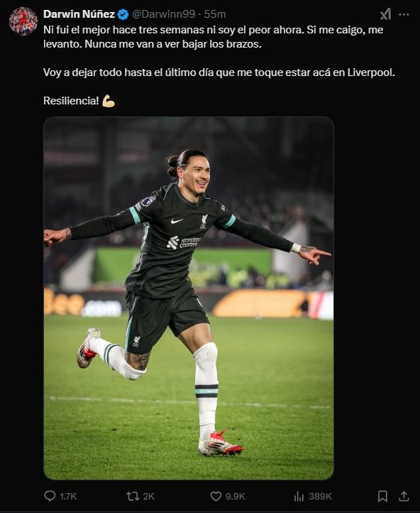 그는 "3주 전 다르윈은 최고였고, 팀에게 승점 3점을 안겨주었다. 하지만 어제, 나는 운이 없었고 골을 놓쳤다. 그러자 다시 나는 ‘최악’이자 ‘실패작’이 되었다. 나는 넘어지더라도, 다시 일어날 것이다. 누구도 내가 포기하는 모습은 보지 못할 것이다. 내가 리버풀에 남아있는 한 그 마지막 날까지 내 모든 것을 쏟아붇겠다. 회복력!"이라는 글을 올렸다.
