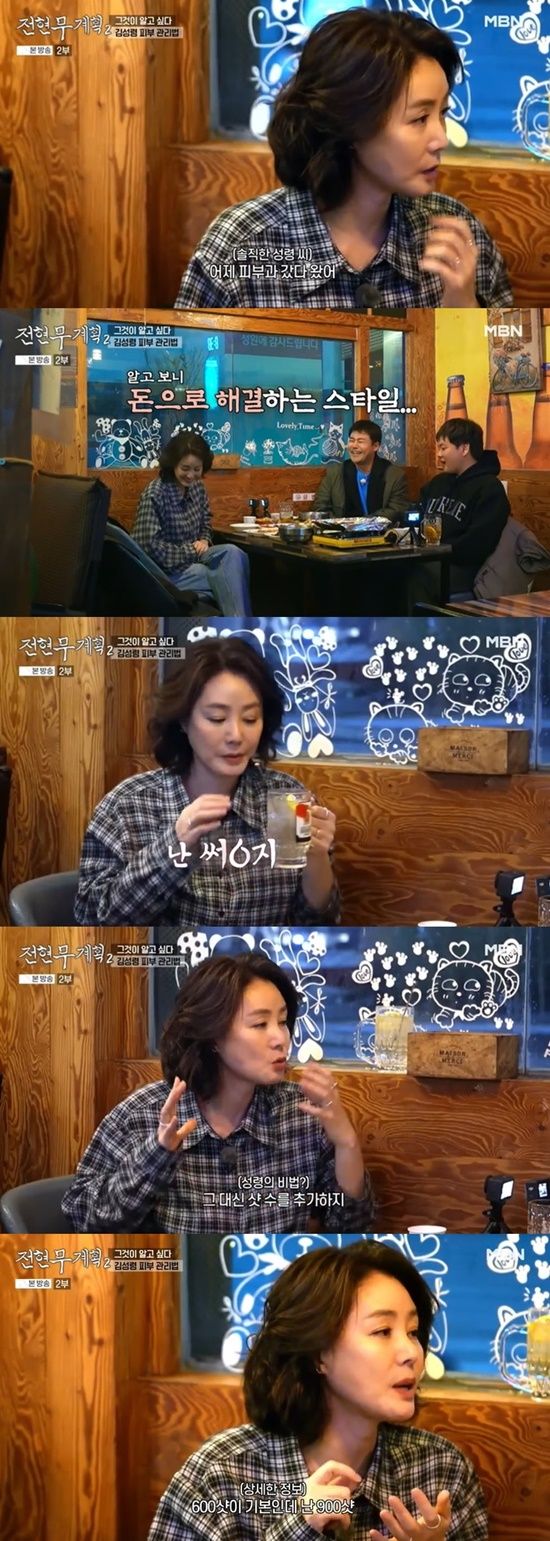 김성령은 "벌어서 나한테 투자하는 돈이 어마어마하다"고 고백했고, 전현무는 "그래야 또 계속 사랑을 받지 않겠나. 누나가 이렇게 시원시원하게 얘기해주니까 너무 좋다"고 고마워했다.
