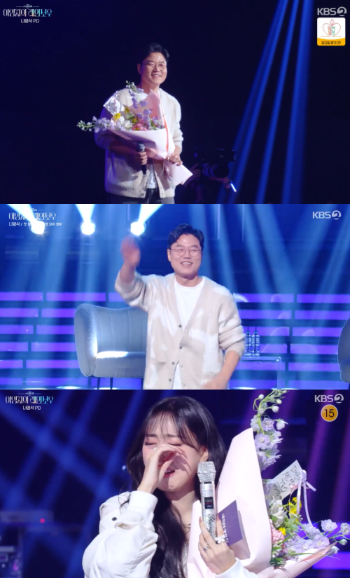 나 PD의 영상 편지가 끝나자 갑자기 ‘TV는 사랑을 싣고’ 배경 음악이 흘렀고 정말 무대 위로 나 PD가 꽃을 들고 등장했다. 이를 본 이영지는 믿을 수 없다는 듯 놀랐다. 나 PD는 “우리 영지가 MC 마지막이라고 해서 ‘예능으로 낳은 딸’이기 때문에 마지막을 축하해 주고 싶어 나왔다”며 “덕분에 KBS를 13년 만에 왔다”고 말했다.