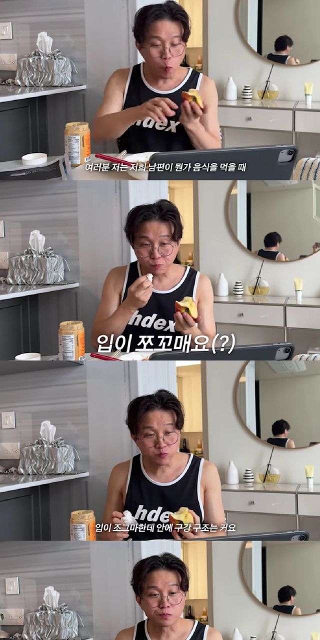 박성광이 사과를 먹는 모습을 보던 이솔이는 "남편이 음식을 먹을 때 입이 작다. 입이 조그마한데 안에 구강 구조는 크다"고 설명하더니 "입을 최대한 크게 벌려서 먹는데 그럼 얼굴이 다 꾸겨진다. 근데 그것도 왜 이렇게 귀여운 지 모르겠다"라며 팔불출 면모를 보였다.