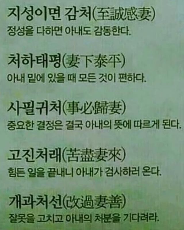 장우혁은 이와 함께 사자성어를 본따서 만든 신조어인 '개과처선', '처하태평' 등의 의미가 담긴 문구를 공유했다. 개과처선은 '잘못을 고치고 아내의 처분을 기다려라', 처하태평은 '아내 밑에 있을 때 모든 것이 편하다'라는 의미다.