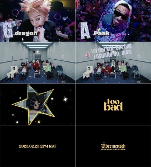 지드래곤(G-DRAGON)은 22일 공식 채널을 통해 25일 발매 예정인 세 번째 정규 앨범 ‘위버맨쉬’(Übermensch)의 타이틀곡 ‘투 배드’(TOO BAD) 뮤직비디오 티저 영상을 게재했다.