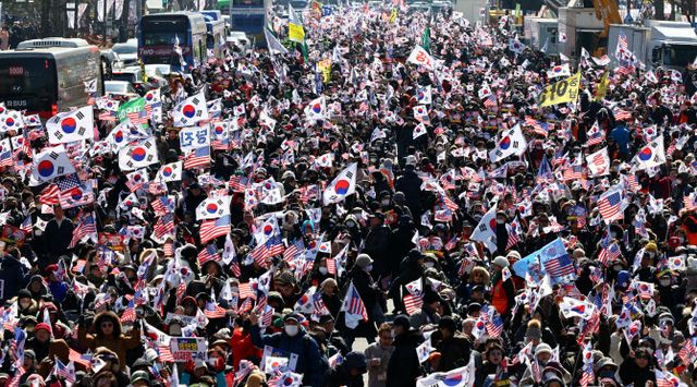 22일 오후 2시 대전 서구 둔산동 시청 인근에는 탄핵 반대 집회를 위해 인파가 몰려 있었다.
