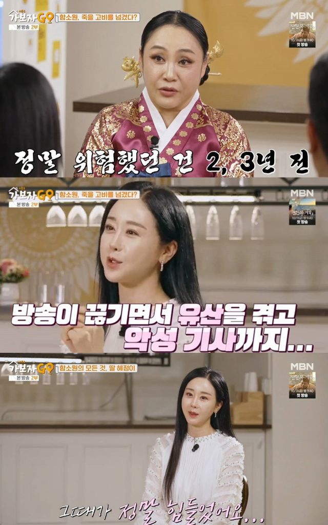 그러나 함소원은 지난해 MBN 예능 '가보자GO 시즌3'에 출연해 "정신적으로 너무 힘들어서 정말 나쁜 생각을 한번 한적이 있다"며 2021년에 방송이 끊기면서 유산과 악플 등이 겹쳤던 당시의 고충을 토로했던 바 있다.