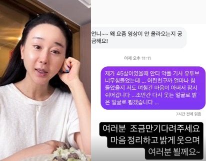 대화 속 누리꾼은 함소원에게 "언니~ 왜 요즘 영상이 안 올라오는지 궁금해요!"라고 메시지를 보냈고, 여기에 함소원은 어제(21일) 제가 45살이었을 때 안티, 악플, 기사, 유튜브 너무 힘들었는데... 어린 친구가 얼마나 힘들었을지 저도 며칠간 마음이 아파서 잠시 쉬어갑니다..."라고 심경을 전했다.