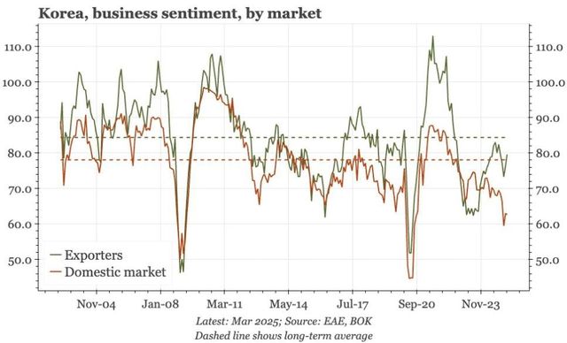 초록색은 수출, 갈색은 내수.2008년 서브프라임 모기지, 2020년 코로나때 수준으로 떨어지려함...
