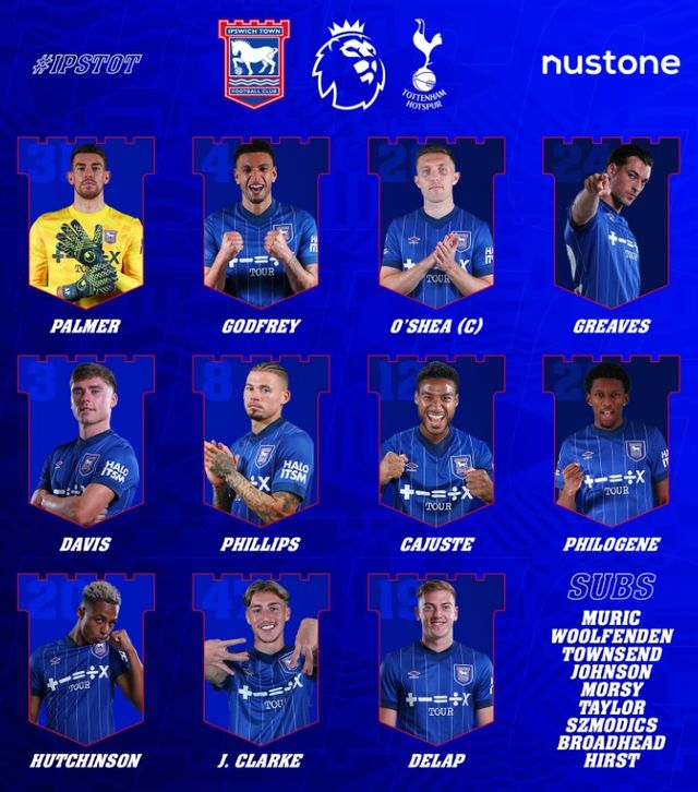 키어런 맥케나 감독이 지휘하는 홈팀 입스위치도 4-2-3-1 전형으로 맞섰다. 알렉스 파머가 골키퍼 장갑을 끼고, 리프 데이비스, 제이콥 그리브스, 다라 오셰이, 벤 고드프리가 백4를 형성한다. 3선은 옌스 카쥐스트와 칼빈 필립스가 지키고, 2선에 잭 클라크, 오마리 허친슨, 제이든 필로진비데이스이 출전한다. 최전방에서 리암 델랍이 토트넘 골문을 노린다.