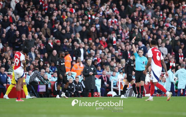 아스널이 대형 악재를 맞았다. 후반 25분 루이스-스켈리가 중앙에서 볼을 뺏겼는데 무리하게 저지하다가 경고를 받았다. 웨스트햄 선수들의 항의가 이어졌고 VAR 판독이 진행됐다. 그 결과 루이스-스켈리는 레드 카드를 받아 그라운드를 떠났다.