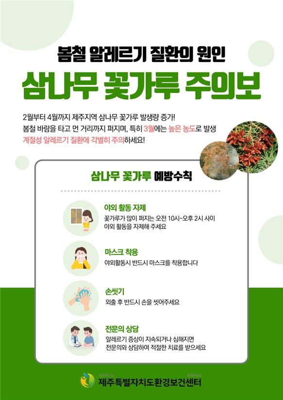 23일 제주도 환경보건센터에 따르면 봄철 발생하는 삼나무 꽃가루는 환경성질환인 알레르기 비염, 아토피 피부염, 천식 등 알레르기 질환을 유발하는 주요 원인 중 하나로 꼽힌다.