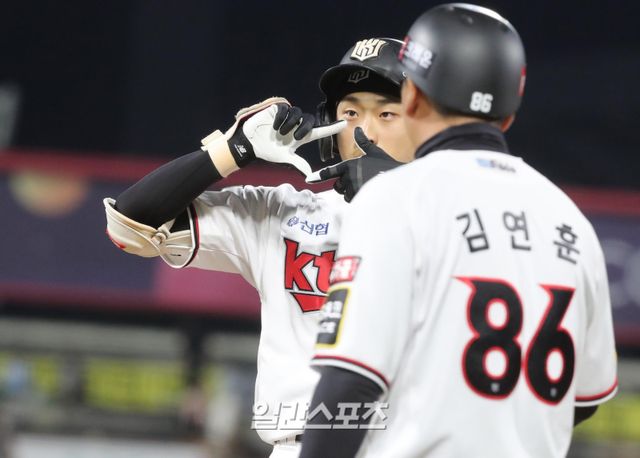 주인공은 유준규. 2002년생이자 2021년 2차 신인 드래프트 3라운더 출신인 유준규는 지난 2022년 '이정후 타격폼'으로 1군에 데뷔, KT 팬들 앞에서 강렬한 인상을 남긴 바 있다. 안타 후엔 손흥민의 '찰칵' 세리머니로 남다른 끼를 선보이기도 했다. 이후 입대해 지난해 제대한 유준규는 마무리캠프에 이어 올해 스프링캠프까지 참가하면서 가능성을 인정받았다.
