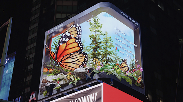 LG전자는 모나크 나비를 시작으로 다큐멘터리 시리즈에 등장하는 멸종 위기종을 3D로 구현해 타임스스퀘어 전광판에서 소개한다.