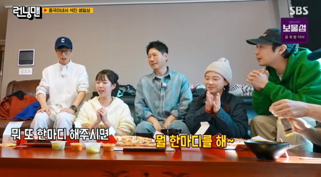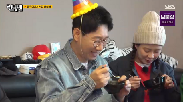 지예은은 “건강식이다. 아무것도 안들어가고 깔끔하게”라고 항변했다. 내친김에 축하송을 부르며 생일 케이크도 들고 왔다. 이를 본 유재석은 “석진이 형 따님이세요?”라고 웃었다.