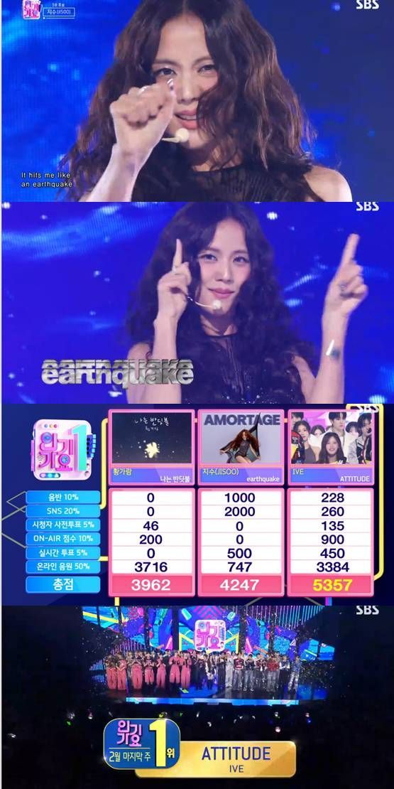 23일 방송된 SBS 가요프로그램 '인기가요'에서는 2월 마지막주 1위 후보로 아이브의 '애티튜드(ATTITUDE), 황가람의 '나는 반딧불', 지수의 '얼스퀘이크(earthquake)'가 오른 모습이 전파를 탔다.