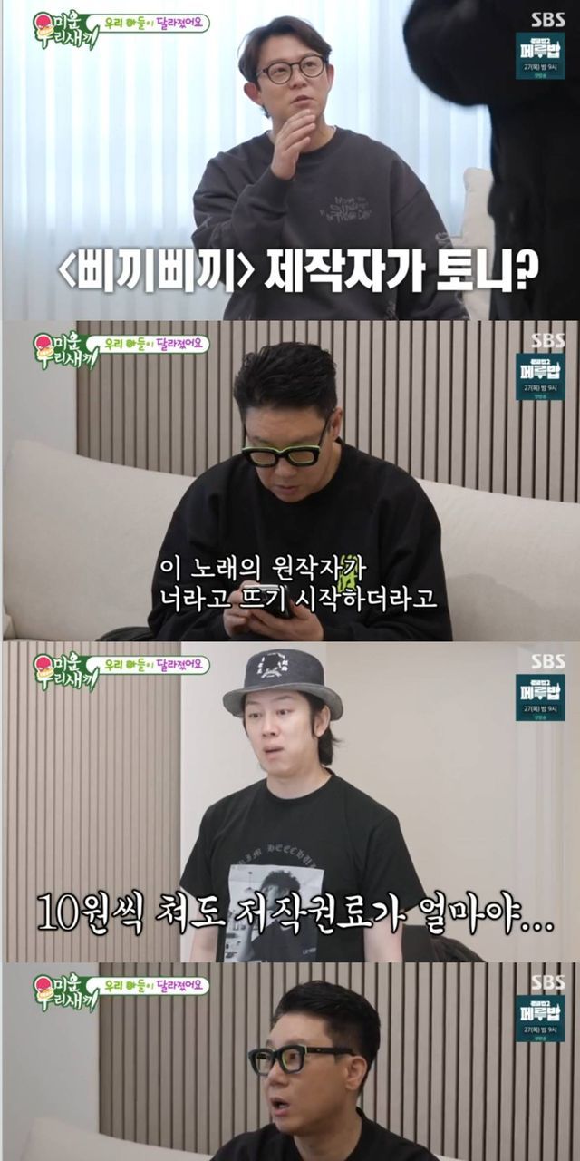 이상민은 "원곡자가 너라고 뜨기 시작하더라"라고 말했다. 토니안은 "8000만 뷰가 나왔더라"라고 했고, 김희철은 "10원씩만 해도 8억인데?"라며 놀랐다.
